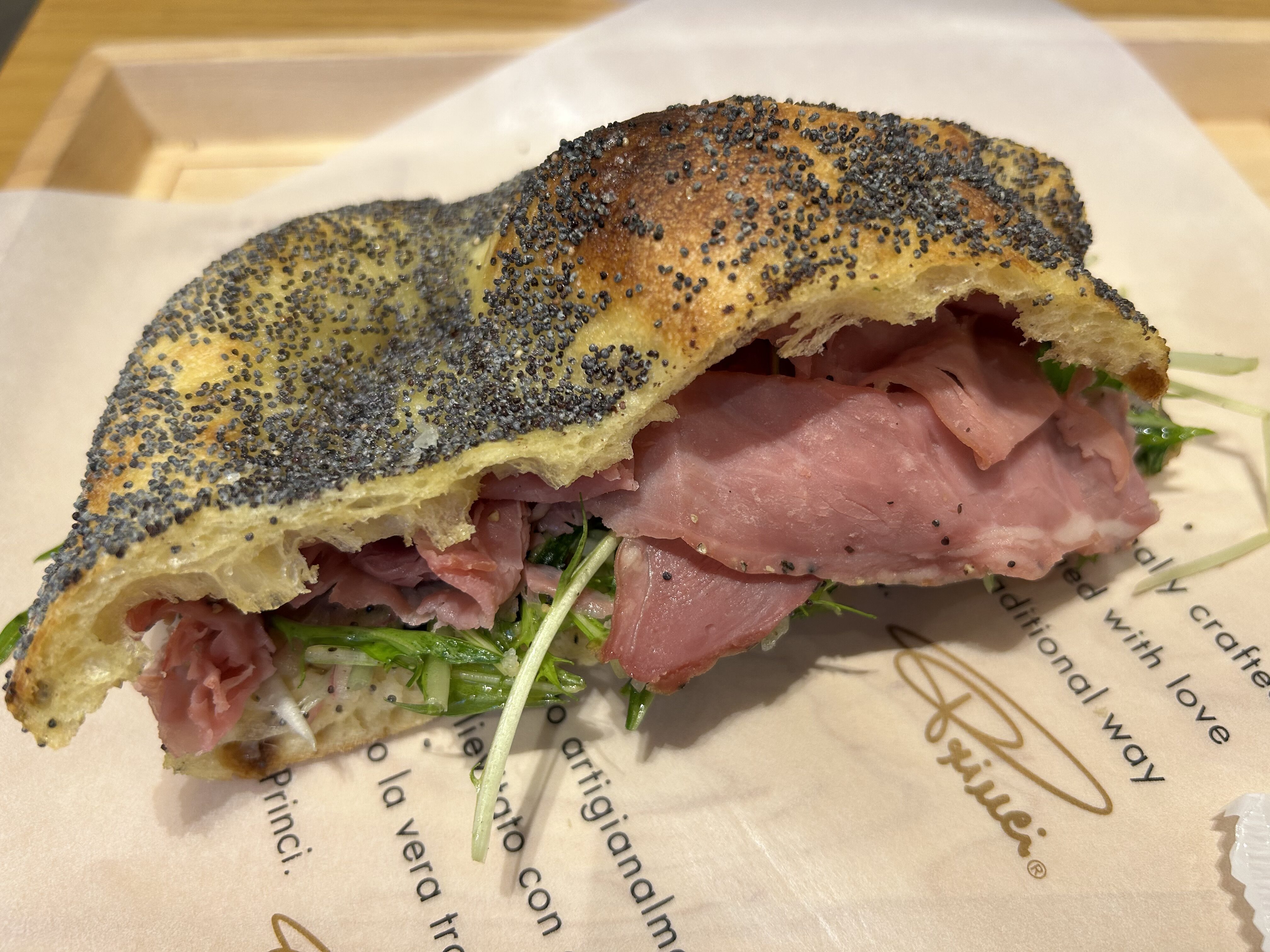 フォカッチャ生地は薄くて硬く、直焼きされていて香ばしいです。ケシの実の香ばしさもプラスされています。