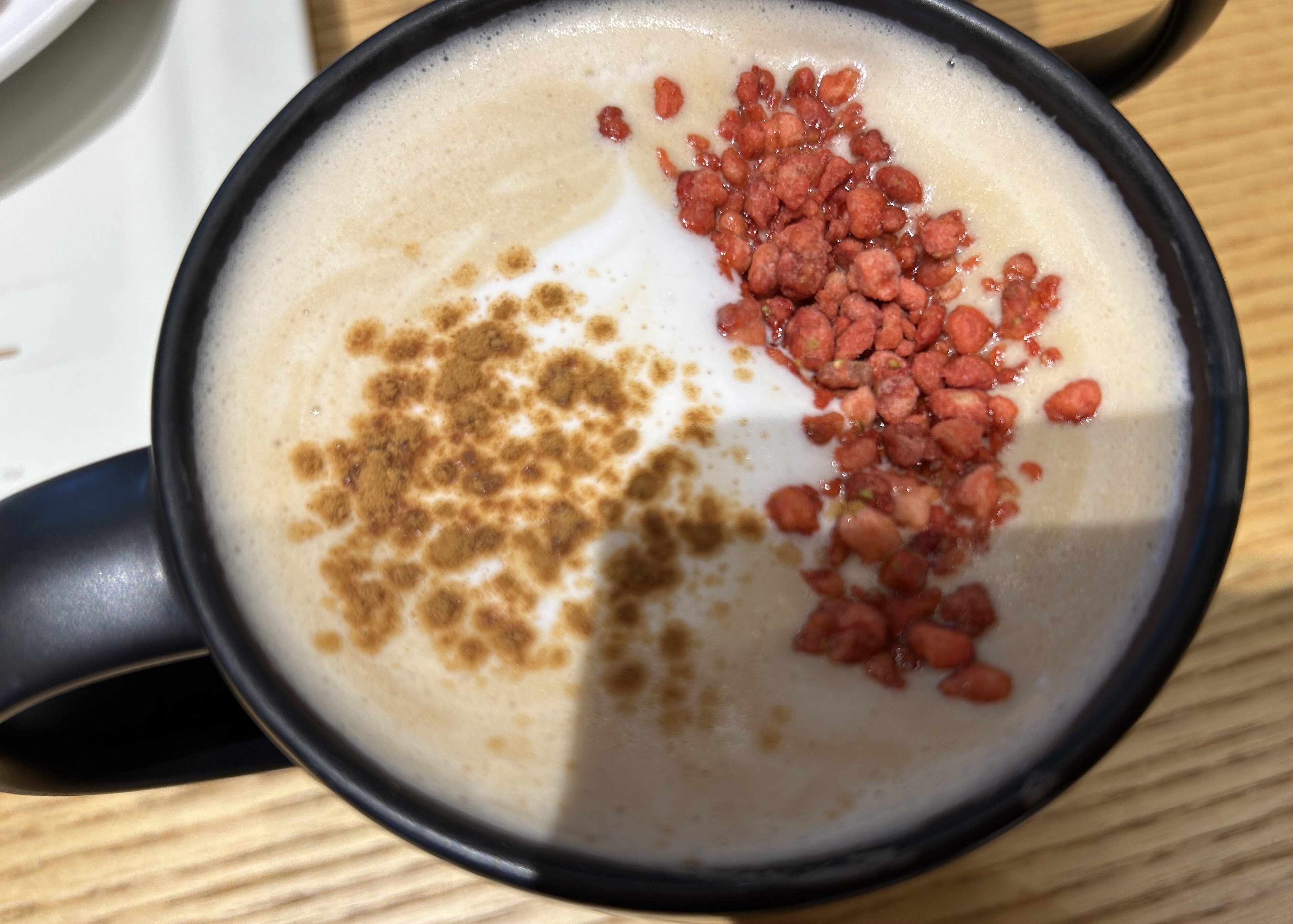 カウンターにさまざまなトッピング:「シナモン」「ミントパウダー」「カカオニブ」「ピンクペッパー」「黒糖」「アガベシロップ」が用意されており、カスタマイズを楽しむことができます。