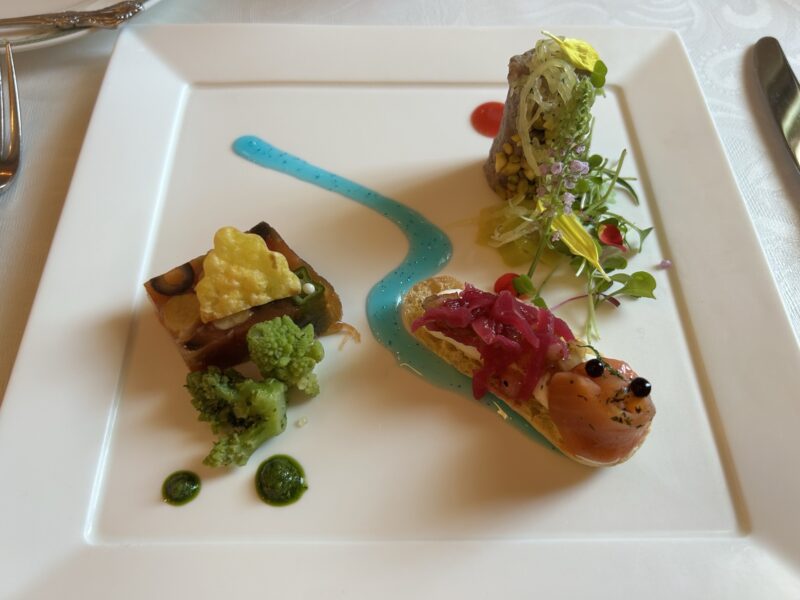 アペタイザー盛り合わせ(シェーブルチーズとサーモントラウト、豆と野菜のゼリー添え、砂肝とビーフのムース ナッツ入り)